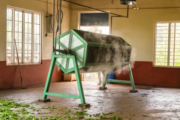 Rolled leaf is dried to reduce moisture content in the final product.
